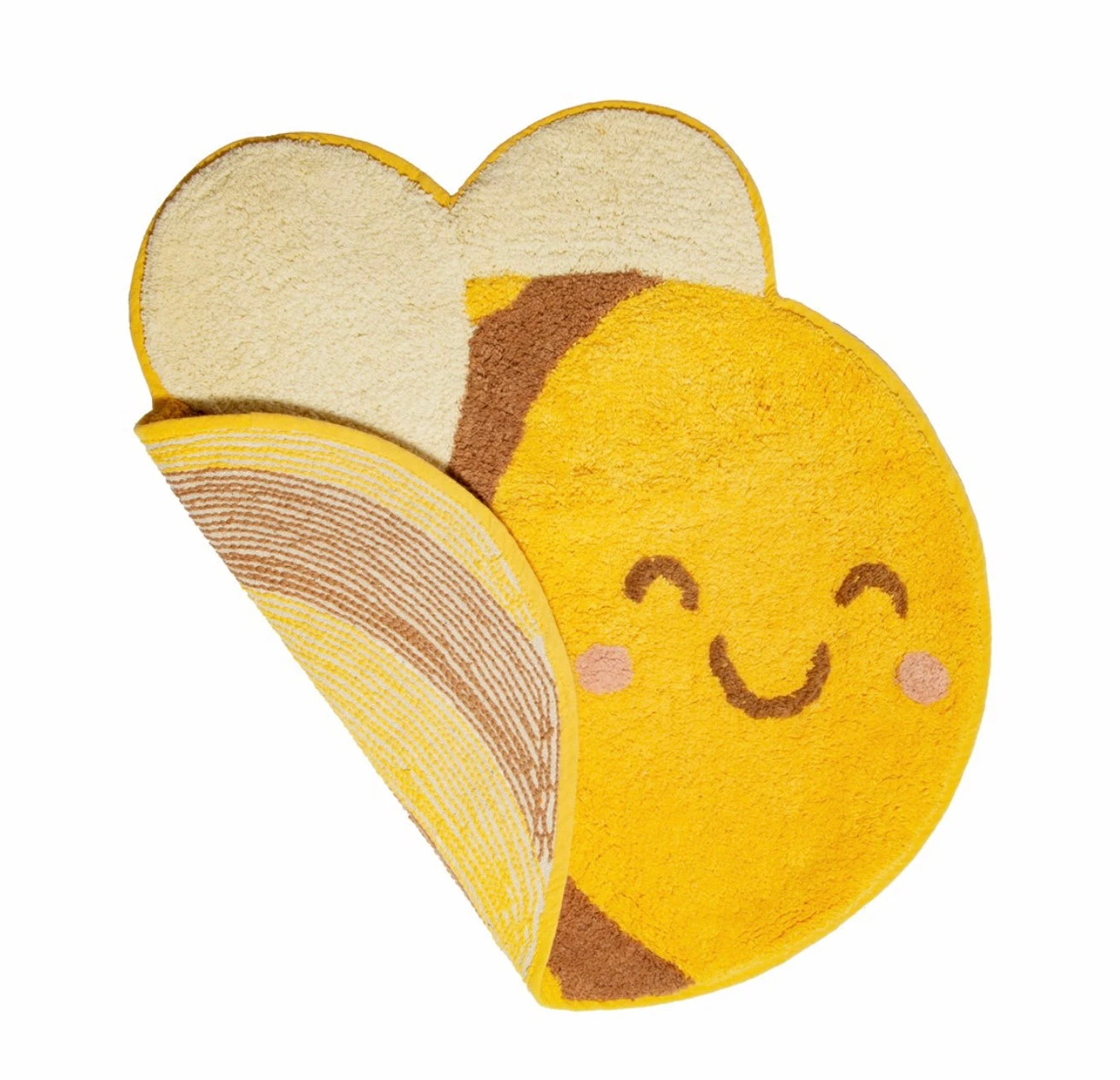 Head down to the hive with our adorable happy bee rug. Shaped as our buzzing creature in shades of honey yellow. A simple accessory to transform your animal lover’s room into a destination of adventure and fun. Please note this rug is not suitable for bathrooms or wet surfaces as it has no anti-slip backing.