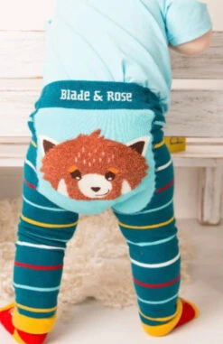 Our chunky red striped shorts feature a thin white stripe. The leggings are complemented by the pale blue cuffs on the legs and the navy blue on the waistband. On the bum is a iconic and recognisable vintage campervan.