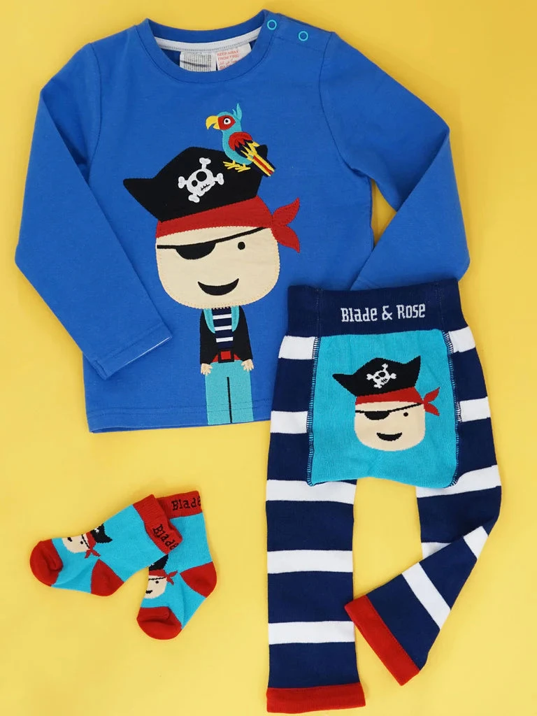 Navy and white stripy leggings with a Percy the Pirate print on the bottom.