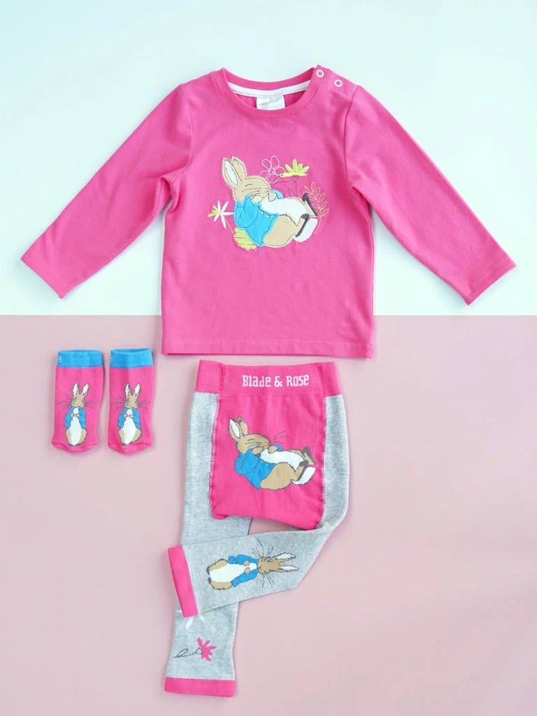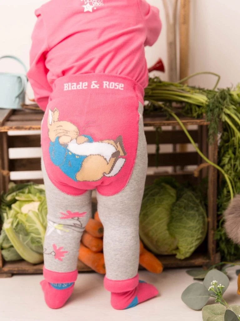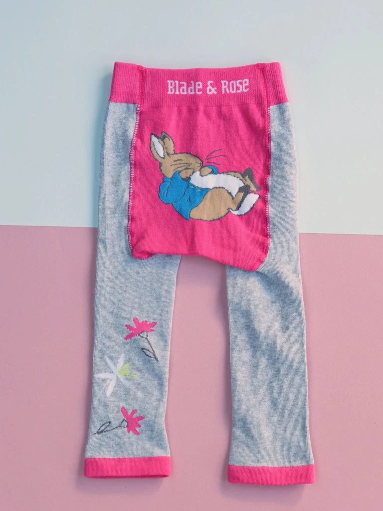 Featuring a snoozy Peter Rabbit on the bottom, and another on each leg, these leggings are enhanced by the pretty flowers growing up them.‚Â