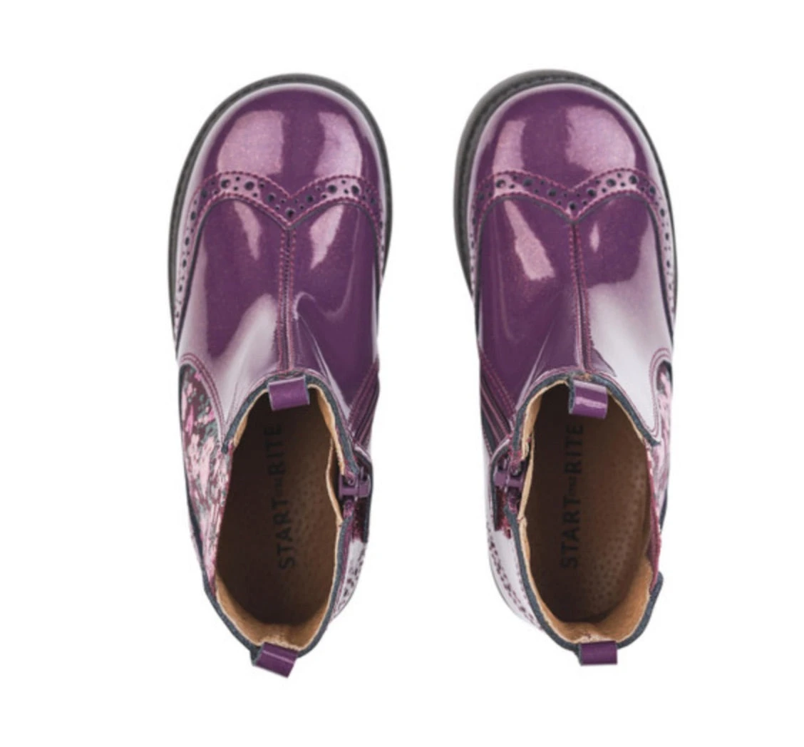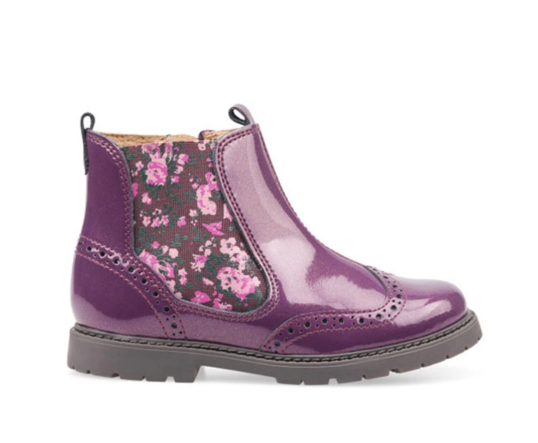Our classic Chelsea boot gives little feet big style in a striking blackcurrant glitter patent. There’s a floral panel and brogue detailing for added style. These boots are easy to pull on and fasten with an elastic panel and quick zip fastening, so they’re perfect for active kids who want to get up and go. Small feet stay warm and dry with soft leather linings, while the durable soles ensure they can take on fun adventures in all weathers.