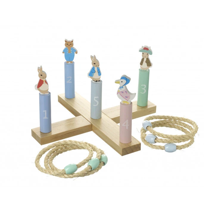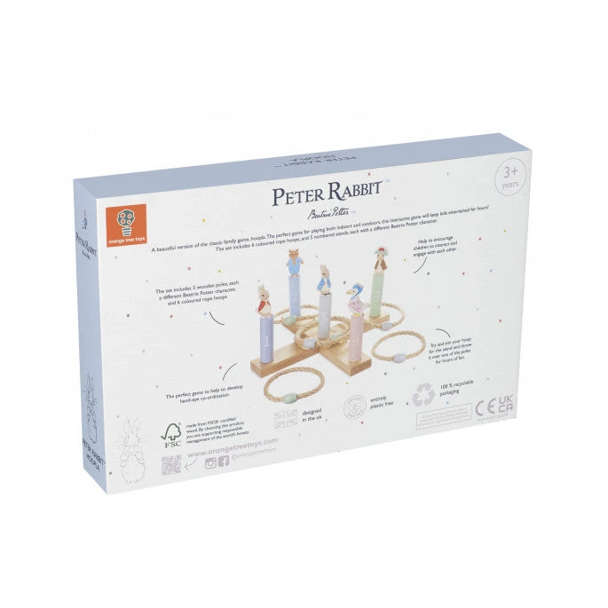 The set includes 5 wooden poles, each featuring a different Beatrix Potter character, and 6 coloured rope hoops.