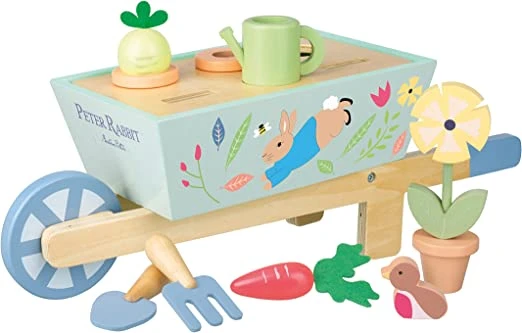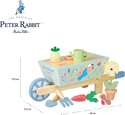 - OFFICIAL LICENSED PETER RABBIT TOYS: Help little ones learn to love the outdoors with this beautiful wooden Peter Rabbit wheelbarrow set. The set contains a sturdy wooden wheelbarrow, a fork and trowel, a watering can, planting pots, a flower, a carrot and turnip and a lovely little robin!