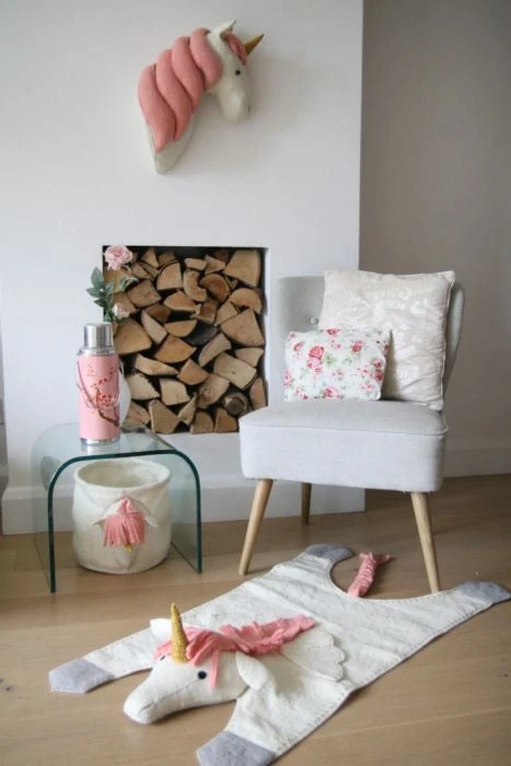 This Felt Pink Unicorn rug adds a special touch to any unicorn-lovers room. Pair with the matching wall decoration and storage basket for a truly magical bedroom! Dimensions: L 150cm W 50cm H 10cm