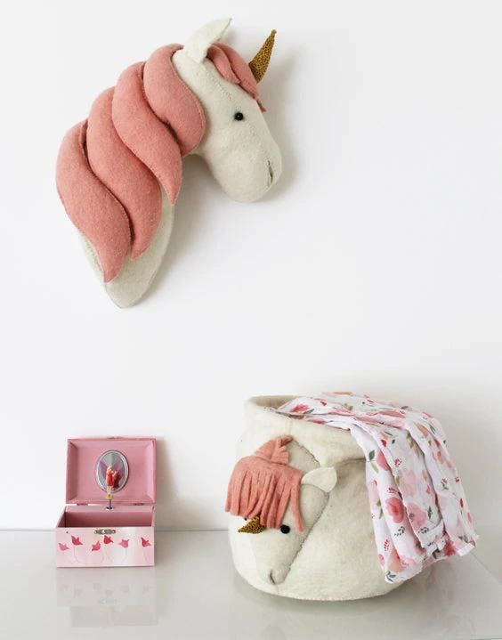 Felt unicorn storage basket by Fiona Walker England. Beautiful room decor that doubles as storage, we just adore this new unicorn basket! Made from 100% felted wool, ethically made and crafted Fiona Walkers collection of new storage baskets for kids is not just fun, it’s charming and characterful.‚Â
